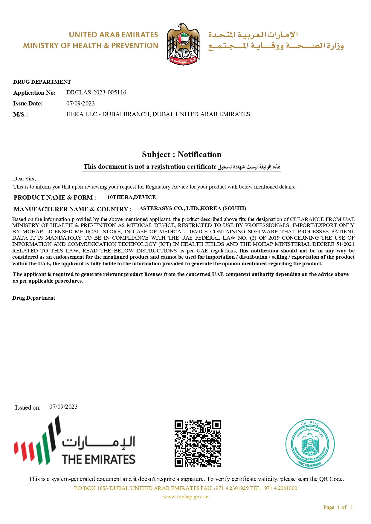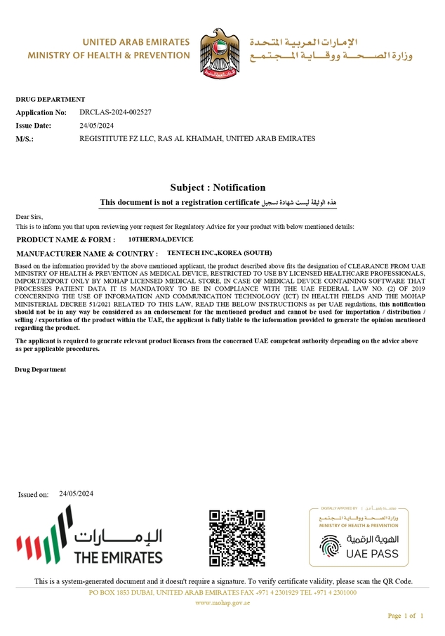 Получен сертификат Министерства здравоохранения (ОАЭ) для 10THERMA