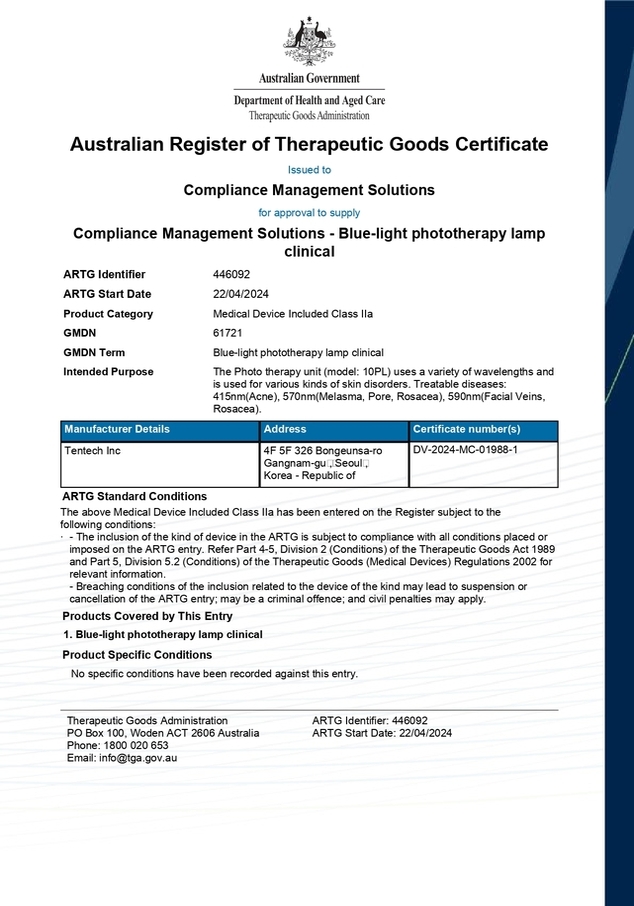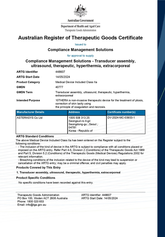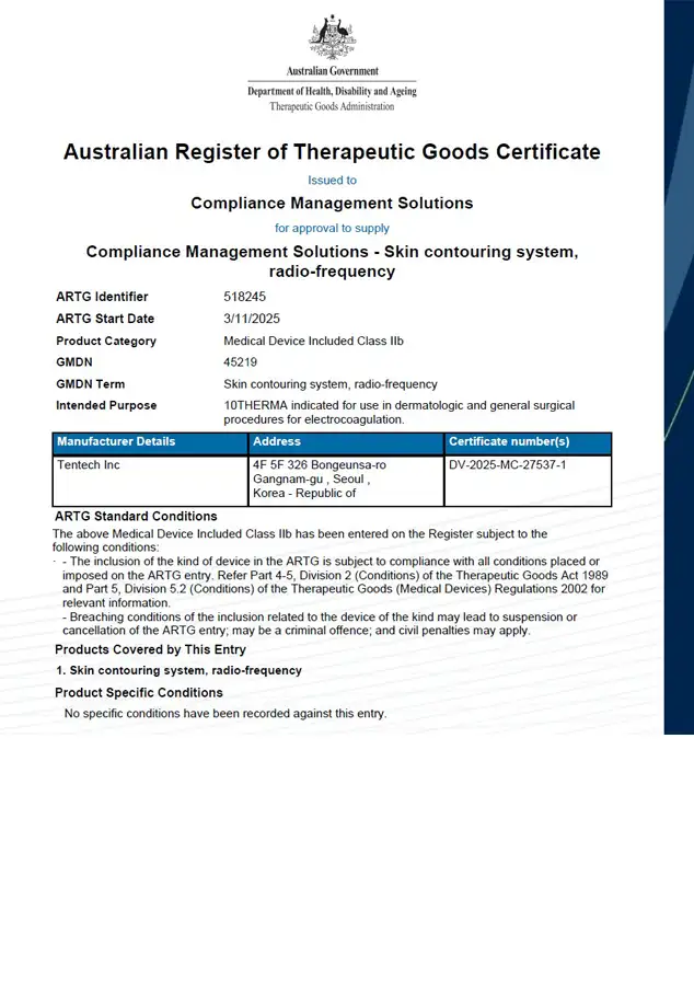 Получен сертификат TGA (Австралия) для аппарата 10THERMA
