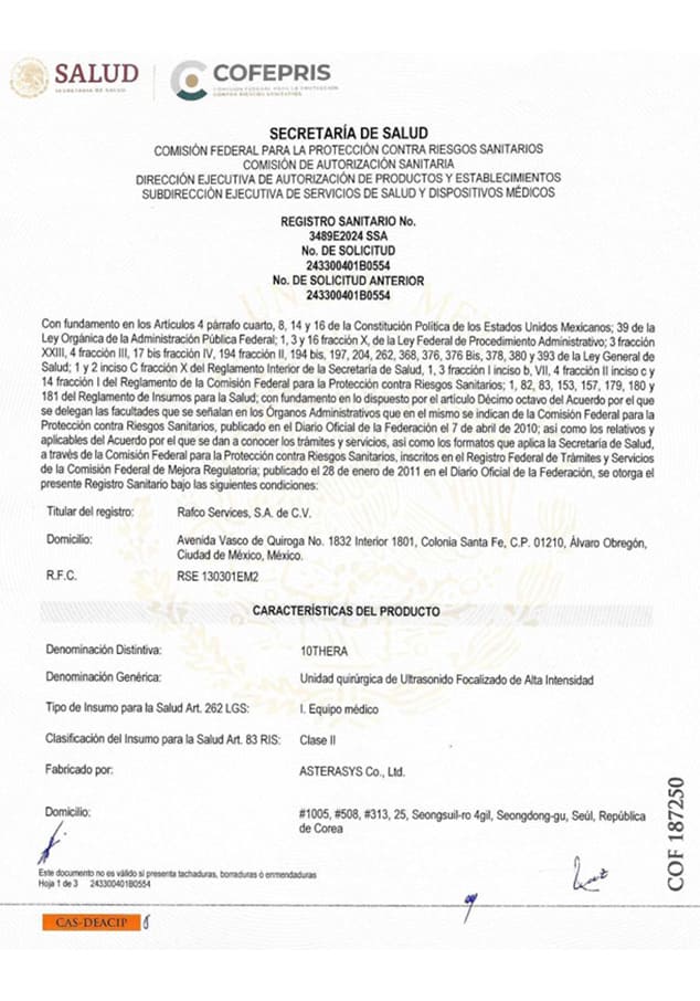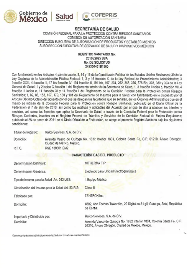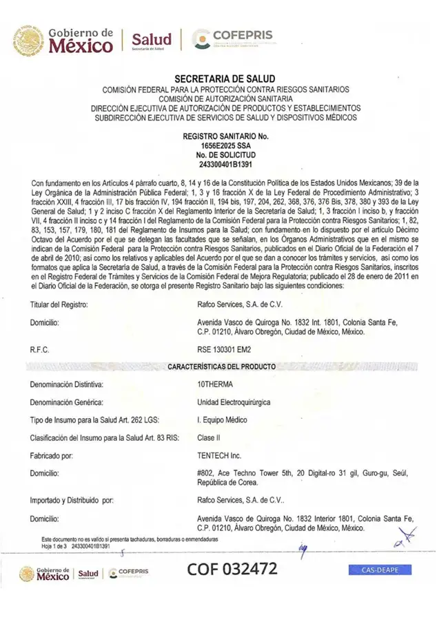 Получен сертификат COFEPRIS (Мексика) для аппарата 10THERMA