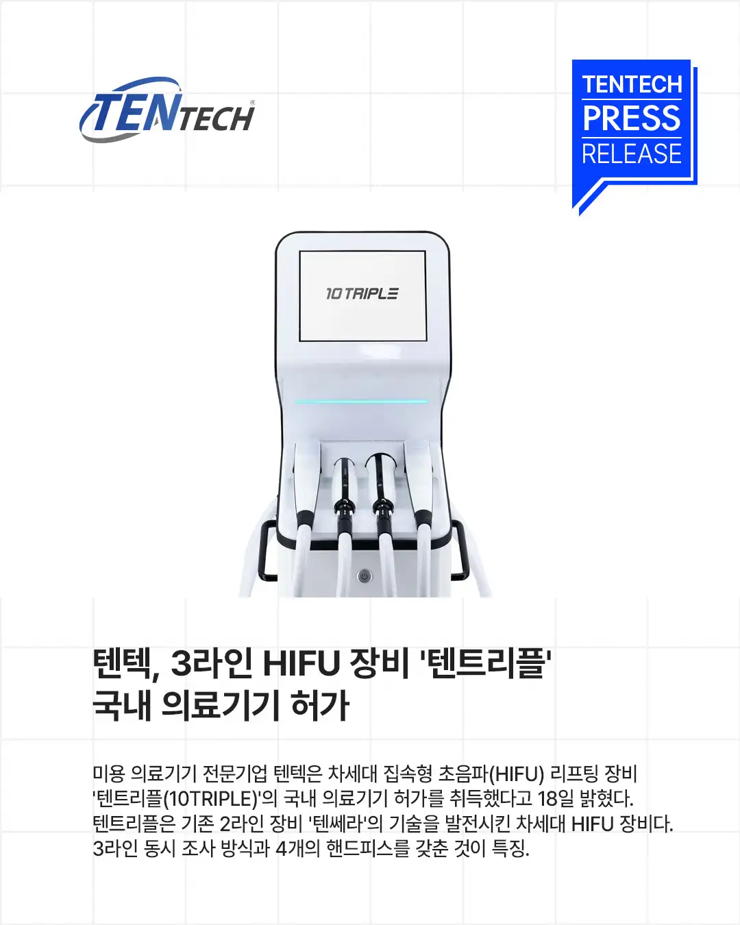 | заголовок | TENTECH получает разрешение на медицинское устройство для устройства "10TRIPLE", 3-линейного HIFU следующего поколения | ||